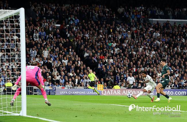 레알이 선제골을 터뜨렸다. 전반 28분 벨링엄의 패스를 받은 호드리구가 우측에서 볼을 잡고 돌파했다. 페널티 박스 안으로 들어가 오른발로 낮게 깔아차 마무리했다. 레알이 1-0으로 앞서갔다.