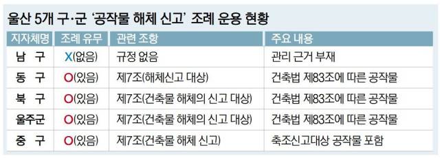 그러나 남구청의 해명과 달리 지자체마다 자체 조례를 제정해 안전망을 구축하고 있다. 울산시 5개 구·군의 ‘건축물 관리 조례’를 보면 남구를 제외한 4곳은 모두 공작물 해체 시 신고를 의무화하는 조항을 두고 있다. 울산 북구(제7조)·동구(제7조)는 물론, 지난해 12월 관련 조항을 정비한 울주군(제7조)도 ‘건축법 제83조에 따른 공작물’을 해체 신고 대상으로 명시하고 있다. 대규모 산업단지가 위치한 전남 여수시와 경남 거제시, 충남 서천군 역시도 모두 조례를 통해 공작물 해체를 관리 중이다.