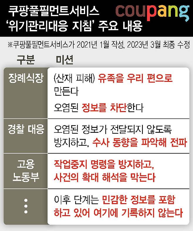 쿠팡은 유족이 노조나 노동단체와 연계할 것을 우려해 “유혹적인 선동이나 잘못된 정보가 많이 들어올 수 있는데 현혹되지 않도록 주의를 당부”하면서 “궁금한 것이나 필요한 사항이 있으면 회사를 믿고 협의하는 것이 문제를 해결하는 가장 빠른 방법임을 알게 하라”고 했다. 지침의 마지막 문구엔 “이후 단계는 민감한 정보를 포함하고 있어 여기에 기록하지 않는다”고 돼 있다.