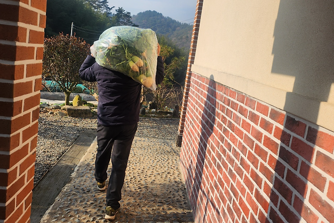 | ▲ 배추를 이고 차로 가는 남편 배추 열 포기 담은 봉지가 이렇게 무거울 수가 ... 내 힘으로는 바로 코 앞으로도 못 옮길 정도 였지만 남편은 번쩍 들어 어깨에 매고 차에 실었다. |