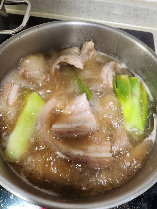 | ▲ 오겹살 수육 덩어리 돼지고기가 아니라 두껍게 썰린 오겹살로 수육을 삶았다. 조리 시간은 줄지만 맛은 변함없다. |