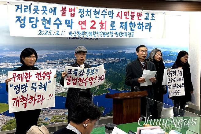 마산창원진해환경운동연합, 창원기후행동은 회견문을 통해 "내년 6월 지방선거를 앞두고 벌써 거리 곳곳에 정치 현수막이 넘쳐나 시민들이 불만을 터뜨리고 있다"라며 "행정안전부에 따르면 올 상반기에 접수된 전국 정당 현수막에 관한 민원이 1만 8000건이 넘었다고 한다. 민원 사유는 위치 부적절, 민망한 내용이라고 한다. 불법 정당 현수막 1만 3000여건 중 게시기간 위반이 64%, 현수막 높이 등 설치 방법 위반 17%, 어린이 보호구역 등 설치장소 위반이 9%였다"라고 설명했다.