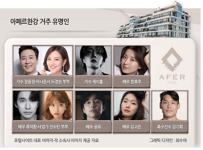 공유, 김고은, 류덕환·전수린 부부, 수애, 장윤정·도경완 부부, 제이홉, 한효주…. 이름만 들어도 알 만한 톱 연예인들이 사는 곳. ‘아페르한강’은 입주민의 30% 이상이 연예인이다. 초고가 주택에 유명인들이 산다는 뉴스는 종종 보지만, 아페르한강처럼 한 단지에 밀집해 사는 사례는 드물다. 아페르한강은 준공 일년만에 어떻게 ‘연예인 아파트’라는 타이틀을 얻게 됐을까.