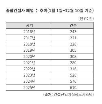 11일 건설산업지식정보시스템에 따르면 올해 1월 1일부터 12월 10일까지 폐업을 신고한 종합공사업 수는 610건이다.