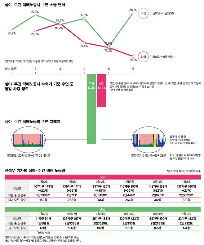 류 기자는 신체 변화 측정을 위해 24시간 활동혈압계, 수면을 기록하는 액티그래프, 피부온도를 측정하는 바이탈링을 착용했다. 택배기사들은 업무 특성상 활동혈압계를 착용할 수 없어 수면 및 피부온도만 측정했다. 모든 생체 신호는 직업환경전문의 김현주 이화여대목동병원 교수의 조언을 받아 분석했다.