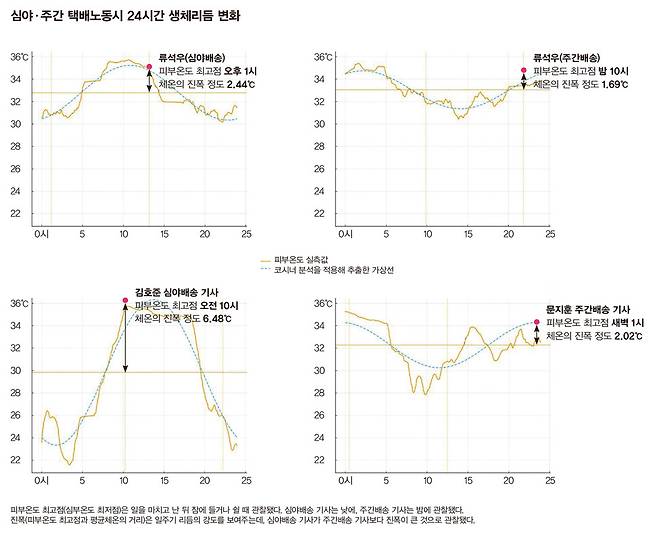 피부온도의 ‘진폭’도 리듬 변화에 힌트를 준다. 심야배송 기사 김호준(43·가명)씨의 경우 하루 평균 피부온도와 최고온도의 차이가 6.48℃로 크게 벌어진 반면, 문지훈씨는 2.02℃였다. 기자 역시 심야배송을 할 땐 2.44℃였는데, 주간배송 시기엔 1.69℃로 줄어들었다. 이는 심야노동이 체온 리듬을 흔들고, 주간노동이 리듬을 다시 좁혀준다는 흐름을 보여준다.