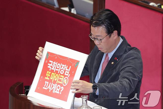 (서울=뉴스1) 신웅수 기자 = 곽규택 국민의힘 의원이 11일 서울 여의도 국회에서 열린 제430회국회(임시회) 제1차 본회의에서 형사소송법 일부개정법률안(대안)에 대한 무제한 토론(필리버스터)를 하고 있다. 2025.12.11/뉴스1