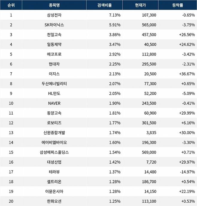 이어 검색비율 2위의 SK하이닉스(000660)는 하락률 3.75%로 하락 마감했다. 검색비율 3위의 천일고속(000650)은 26.56% 상승 마감했다. 검색비율 4위 일동제약(249420)은 24.62% 상승했다. 검색비율 5위 에코프로(086520)는 3.42% 하락했다.