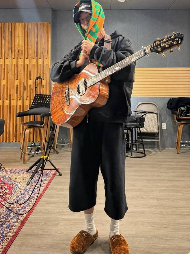 특히, 후드티셔츠 위에 스카프나 목도리를 두르는 독특한 패션 센스를 선보이며 시선을 사로잡았다. 그의 어쿠스틱 기타 스트랩에는 하트 모양의 자수 배지와 ‘ROYROSE’ 문구가 새겨진 핀, 평화 모양의 핀 등 다양한 굿즈들이 부착되어 있어 눈길을 끌었다.
