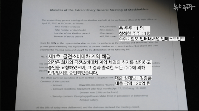 영어로 기록된 주주총회 회의록은 아래와 같다. 김종춘이라는 사람에게 20억 원을 빌려주라는 주주 총회 의결이 이루어졌다.