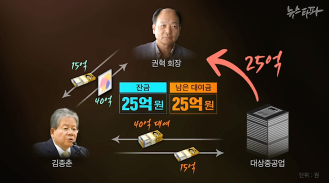 정리하면, 권혁 회장은 김종춘씨로부터 40억 원 어치 그림을 구매한 뒤 대상중공업으로 하여금 김종춘 씨에게 40억 원을 빌려주게 했다. 그런데 권혁 회장은 김종춘 씨에게 그림값을 15억 원만 줬고, 김종춘 씨 역시 대상중공업에서 빌린 돈 중 15억 원만 갚았다.