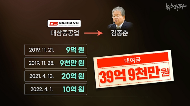 김종춘 씨라는 사람에게 빌려준 돈은 이것만이 아니었다. 2021년 4월 13일에 빌려준 20억 원 외에도, 같은 방식으로 2019년 11월 21일 (9억 원)과 28일(9,000만 원)에 9억 9,000만 원, 2022년 4월 1일에 10억 원이 출금돼 김종춘 씨에게 전달됐다. 모두 합하면 회사 자금 40억 원에 육박하는 회사 자금을 빌려준 셈이다.