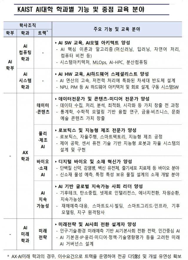 AI대학에는 AI컴퓨팅학과 AI시스템학과, AX학과(데이터콘텐츠AI, 물리제조AI, 바이오소재AI, AI지속가능성 등 4개 트랙), AI미래학과(미래전략 트랙) 등 4개 학과로 구성했다.