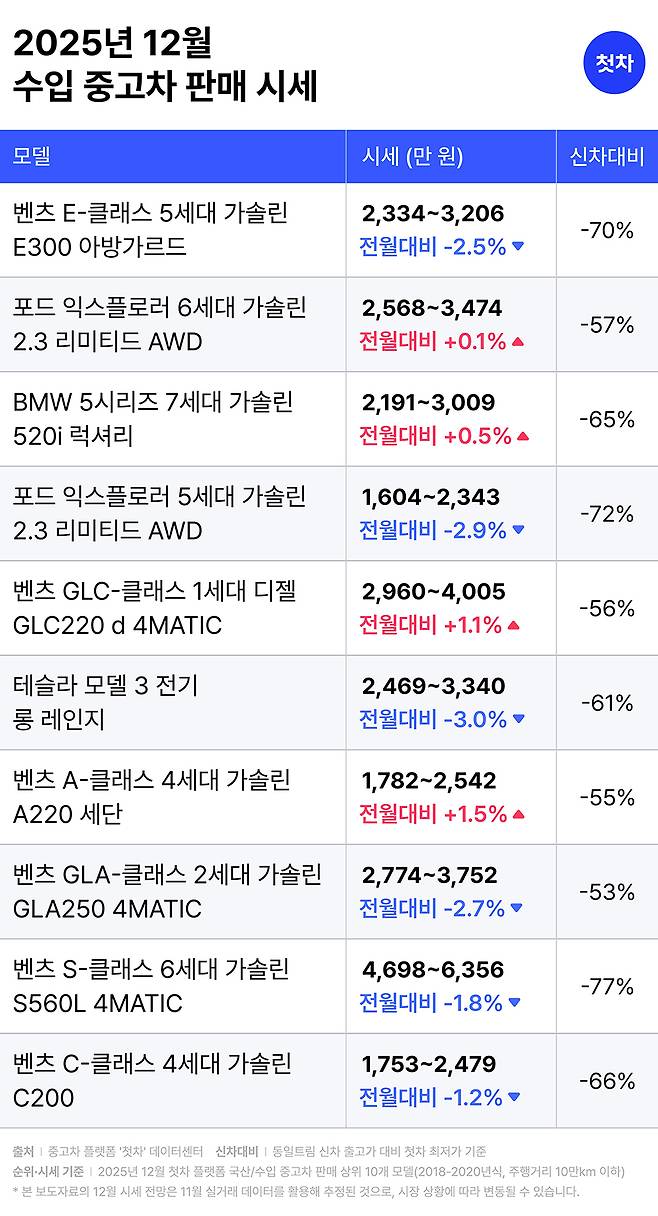 모바일 중고차 플랫폼 ‘첫차’가 2025년 12월 국산·수입 인기 중고차 모델 20종에 대한 시세 전망을 발표했다.