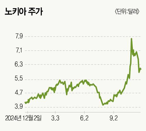 미국 뉴욕 증시에 주식예탁증서(ADR) 형태로 상장된 노키아는 최근 한 달간 36.2% 상승했다(10월 7일~11월 6일 기준). 10월 28일에는 7.77달러에 장을 마감하며 2015년 4월 이후 10년여 만에 최고치를 기록했다. 이후 주가가 6달러 안팎에서 횡보하지만 머지않아 다시 반등할 것이란 기대가 크다.