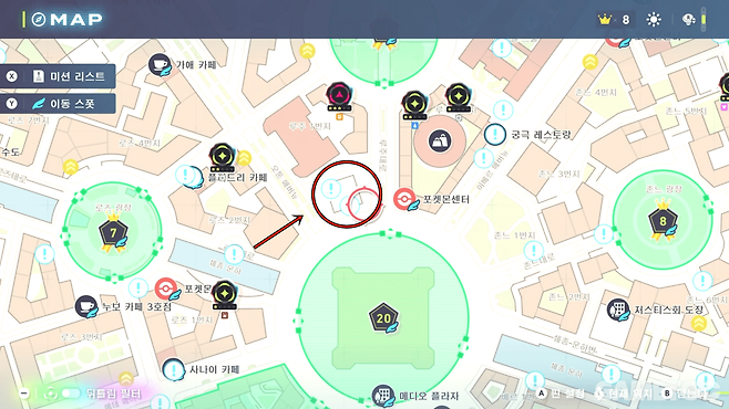 ③ 아래 움짤대로 '프리즘 타워 그림자'가 코트 위에 그려진 '몬스터볼'과 겹칠 때 조사하기를 누른다