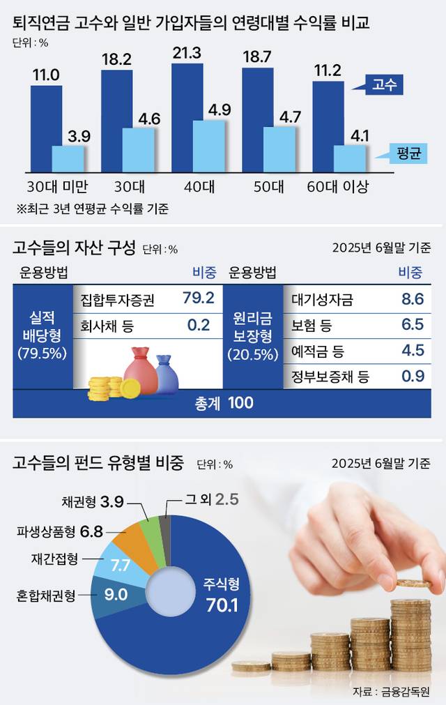 권역별 차이도 존재했다. 증권사 이용자는 실적배당형 비중이 83.6%로 가장 높았고, 보수적인 가입자가 많은 은행(80.2%)과 보험(73.4%) 권역에서도 고수들은 높은 수준의 실적배당 상품 비중을 유지했다.