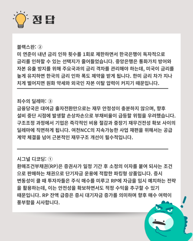 ■ 한은 금리 딜레마: 미국 연준이 기준금리를 3회 연속 인하했지만 한국은행은 환율 불안과 부동산 과열 우려로 금리 인하가 어려운 상황이다. 원·달러 환율은 1473원에 마감하며 연준 금리 인하에도 불구하고 하락 폭이 제한적이었고, 고환율 장기화 시 내년 물가가 0.2%포인트 추가 상승할 전망이다.