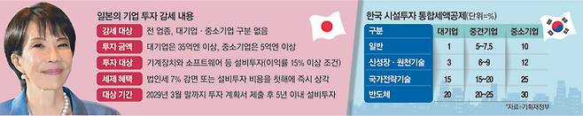 한국이 기업 규모나 업종, 투자 대상에 따라 복잡한 투자 세제 인센티브 제도를 운용해 기업들의 투자 의욕을 꺾는 것과는 전혀 다른 행보다. 특히 한국은 최근 법인세를 1%포인트 인상하기로 하는 등 기업 환경을 옥죄고 있어 대조적이다. 반면 일본은 기업의 투자를 적극 끌어내 인공지능(AI)과 반도체, 조선 등 17개 성장 분야를 집중 육성한다는 계획이다.