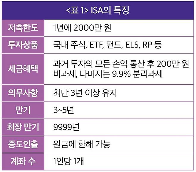 세부적으로 살펴보면, 1년에 2000만 원까지 납입할 수 있고, 최단 3년에서 최장 5년을 유지할 수 있으니 원금 기준으로 6000만 원에서 1억 원을 굴릴 수 있는 계좌다. 즉 목돈을 굴리기 좋은 계좌라기보다는 목돈을 만드는 데 최적화된 계좌인 것이다. 가입자가 가장 좋아하는 점은 '원금'에 한해 페널티 없이 언제든 '중도 인출'이 가능하다는 것이다. 왜 그런가 하면 세제 혜택을 주는 계좌들은 대개 혜택에 대한 페널티로 원금을 일정 기간 묶어둬야 하는 경우가 많기 때문이다. 이렇다 보니 ISA는 연금처럼 목돈을 묶어놓기는 싫고, 절세 혜택을 챙기고 싶다거나, 주식·ETF 등에 투자하면서 비과세 혜택을 누리고 싶은 이들에게 필수인 상품이다(<표1> 참조).