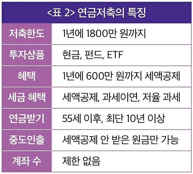 연금저축은 이름만 들으면 '연금을 준비하기 위한 계좌인가 보다' 하고 생각하기 쉽지만, '연금저축'이라는 명확한 하나의 상품 카테고리를 지칭한다. 연간 최대 1800만 원까지 납입할 수 있고, 이 가운데 600만 원까지 세액공제가 되기 때문이다. 세액공제율은 소득 5500만 원을 기준으로 초과일 경우에는 13.2%, 이하일 경우에는 16.5%가 적용된다. 예를 들어, 연봉이 5000만 원인 직장인이 연금저축에 연간 600만 원을 납입하면 연말정산 때 16.5%에 해당하는 99만 원을 환급받을 수 있다.이렇게 세액공제를 받은 후 운용하는 과정에서 생기는 수익에 대해 세금 납부 시기를 추후(연금 받을 때)로 미뤄주는데 이것을 '과세이연' 혜택이라고 한다. 과세이연은 연금을 운용하는 수십 년의 기간 동안 세금을 내지 않고 재투자해 수익률을 극대화할 수 있는 좋은 제도다. 하지만 혜택과 페널티가 '트레이드오프' 관계다. 가입 기간 중 세제 혜택을 많이 주는 대신 55세 이전에 중도 인출하면 기타소득세로 16.5%가 부과돼 세금 폭탄을 맞을 수 있으니 주의해야 한다. 정리하면 연금저축은 충분한 세액공제를 제공해 연말정산 준비를 돕고, 과세이연을 통해 복리 효과를 극대화할 수 있다. 노후 준비 자금을 마련하는 과정에서 두 마리 토끼를 한 번에 잡을 수 있는 상품인 셈이다(<표2> 참조).