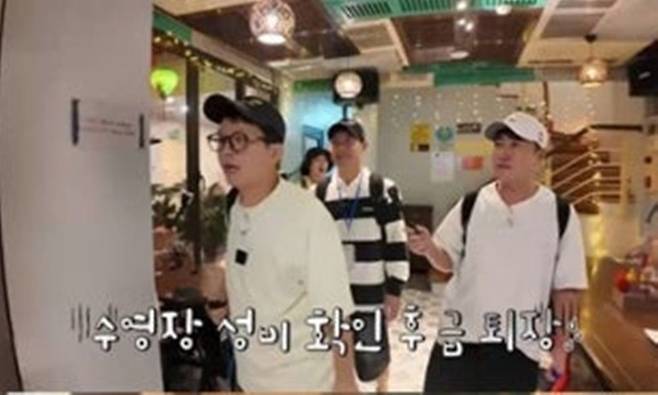 곧이어 숙소에 도착한 이들은 생각보다 괜찮은 숙소 외관에 만족하며 체크인한다. 그러나 로비 근처에 있는 월풀 수영장을 본 장동민은 "여기 완전 남탕"이라며 동공 지진을 일으킨다. 김준호 역시 "전부 남자다. 혹시 여기 남성 전용 숙소 아니냐"고 따진다. 쏟아지는 원성에 홍인규는 "이곳이 조식 포함해서 맥주도 무제한인데 5인 기준 6만 5천 원"이라며 가성비 숙소임을 강조한다. 하지만 장동민은 "그렇게 저렴한 무제한 맥주라면 가짜 맥주로 봐야 맞다"고 말해 현장을 초토화시킨다.