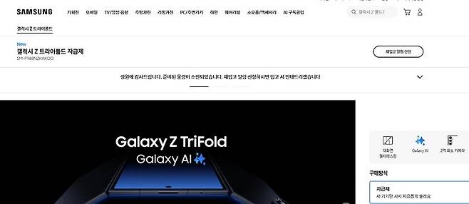 오늘 삼성전자에 따르면 삼성닷컴에 올라온 트라이폴드 자급제 물량은 매진됐습니다. 온라인에서는 수분만에 매진됐다는 후기가 나올정도로 빠르게 물량이 사라진 것으로 알려졌습니다.