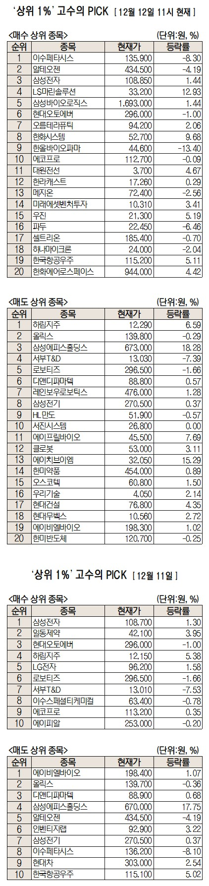 미래에셋증권은 자사 고객 중에서 지난 1개월간 수익률 상위 1% 투자자들의 매매 종목을 집계해 실시간·전일·최근 5일 기준으로 모바일트레이딩시스템(MTS) 상에서 공개하고 있다. 이 통계 데이터는 미래에셋증권의 의견과 무관한 단순 정보 안내이며 각각의 투자자 개인에게 맞는 투자 또는 수익 달성을 보장하지 않는다. 또 테마주 관련 종목은 이상 급등락 가능성이 있으므로 유의해야 한다.