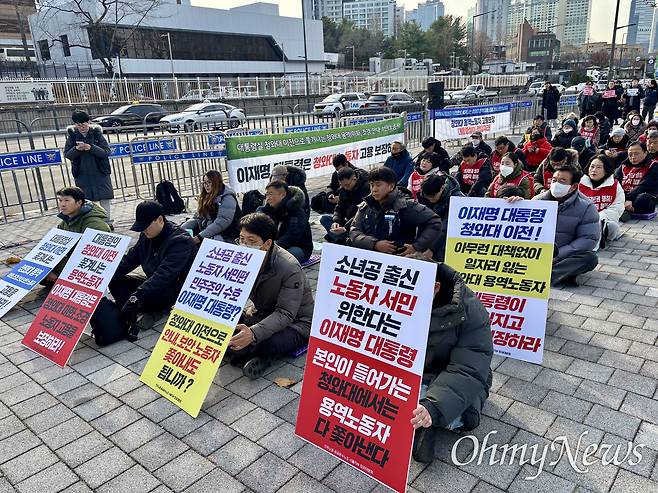 청와대 하청 노동자 등 60여 명은 12일 오전 2시 서울 용산구 대통령실 앞에서 집회를 열고 "소년공 출신 대통령이 본인이 들어가는 청와대의 용역 노동자들을 다 쫓아낸다" 등의 문구가 적힌 손팻말을 들어올렸다.