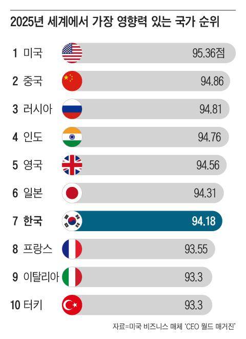 한국이 미국 매체가 꼽은 ‘2025년 세계에서 가장 영향력 있는 국가’ 순위에서 프랑스를 제치고 7위를 기록했다.