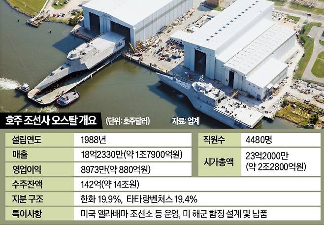 오스탈은 미국 앨라배마 모빌, 캘리포니아 샌디에이고, 호주 서부 헨더슨 등에 생산거점을 둔 미 해군의 4대 핵심 공급 업체 중 하나다. 미국 소형 호위함과 군수지원함 시장 점유율은 최대 60%에 달한다. 오스탈은 미 해군에 연안전투함(LCS)과 고속수송선(EFT) 등을 2034년까지 70여 척 납품하는 계약을 맺은 것으로 알려졌다. 미국에서 유지·보수·정비(MRO) 사업도 벌인다. 2025회계연도(지난해 7월~올해 6월) 매출은 18억2330만호주달러(약 1조7912억원), 영업이익은 8973만호주달러(약 880억원)다.