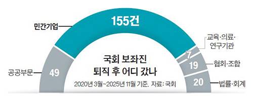 하지만, 이런 보좌관들의 행보에 대해 우려하는 목소리도 적지 않다. 경실련은 “보좌관 업무가 정책이나 규제, 또는 기업 민원과의 접점이 매우 넓기 때문에 ‘로비 위험도’가 높지만 취업 제한은 너무나 좁게 적용되고 있다”고 비판한다. 대표적인 것이 ‘업무 기준 제한’의 적용이다. 국회 보좌관들은 취업 심사에서 기관(국회)이 아니라 부서(상임위)를 기준으로 적용된다는 것이다. 실제의 직무 관련성은 매우 넓지만, 대부분의 보좌관 직급이 3급 이하이기 때문에 기관 기준에서는 제외되고 덕분에 ‘허들’이 느슨하다는 지적이 꾸준히 제기되어 왔다. 실제로 최근 5년간 보좌관의 취업제한 여부 심사결과 중 ‘취업 가능’은 98.3%에 달한다. 또, 251건의 취업 심사 중에서 기관(국회)과의 연관성을 심사한 것은 9건에 불과했다.