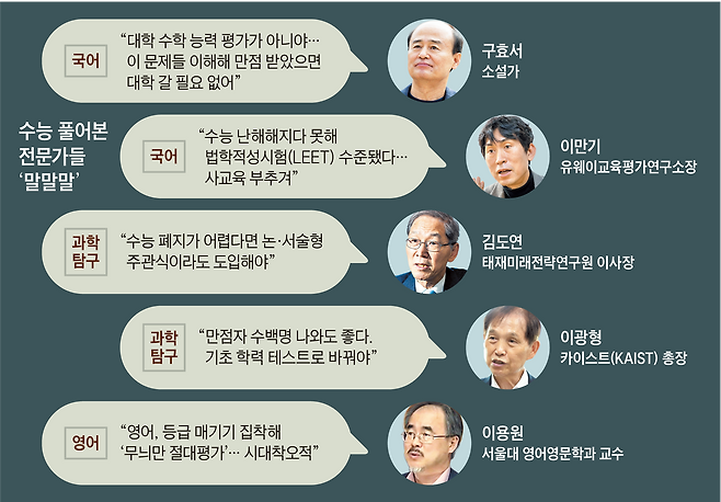 이은홍 국립순천대 국어교육과 교수도 시간 내에 다섯 문제를 풀기는 어려웠다고 한다. 이 교수는 “현재 수능은 주어진 글을 단지 이해하는 데 집중하는 ‘인지적 능력’ 평가에만 치중돼 있다”며 “정작 대학에서 수학하는 데 필요한 비판적·창의적 사고 역량이나 의사소통 역량을 반영하지 못한다”고 지적했다.