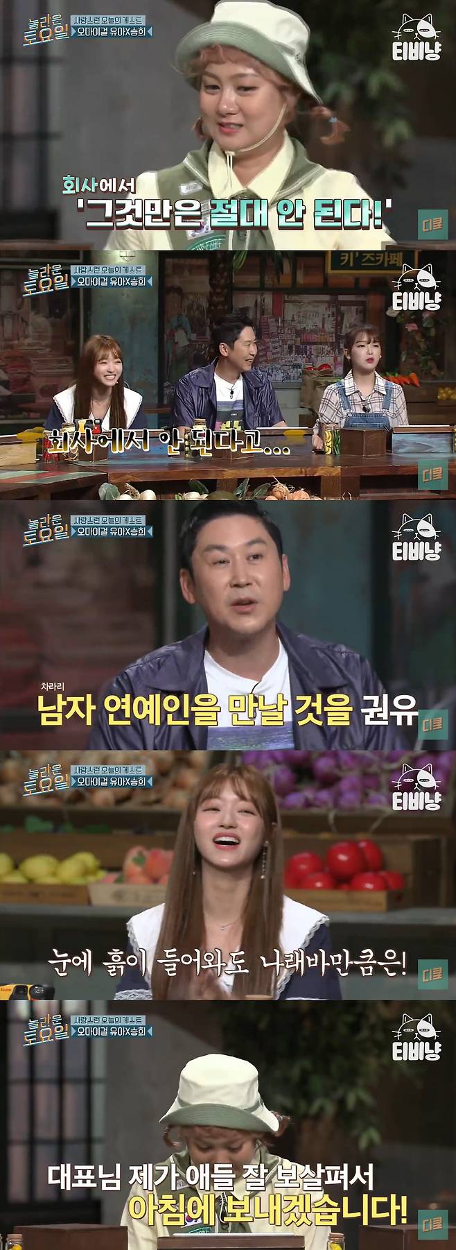 유아는 "효정 언니한테 초대를 해주셨는데 나도 꼭 데려간다 했다. 제가 음주문화를 좋아해서 '나도 갈 수 있다' 했는데 회사에서 안 된다더라"라고 말했고 신동엽은 "회사 입장에서는 차라리 남자 연예인하고 가까이 지내라더라"라고 밝혔다. 박나래 역시 "안 되더라. 핸드폰 생긴 걸 아는데"라고 아쉬워했다. 이에 박나래는 오마이걸 소속사 대표에게 "제가 애들 잘 보살펴서 아침에 보내겠다"고 영상편지를 보냈다.