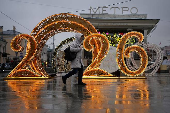 [모스크바=AP/뉴시스] 12일(현지 시간) 러시아 모스크바에 설치된 '2026' 조형물이 조명을 밝히고 있다. 2025.12.13.
