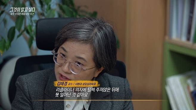 김태경 서원대 상담심리학과 교수는 "(선아 씨가) 리클라이너 의자에 털썩 주저앉은 뒤 못 일어난 것 같다. 그러면 그녀가 거기 주저앉게 된 원인이 분명히 있었을 것"이라며 "그건 외적인 압력, 그러니까 폭행이든 뭐든 거기 주저앉게 된 계기가 있었을 것"이라고 분석했다.