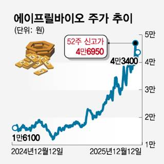 해당 분위기 속 기업 가치도 고공행진 중이다. 지난 4월 1만원 초반대였던 에이프릴바이오 주가는 지난 5일 4만6950원으로 상장 이후 최고가를 경신했다. 12일 기준으론 최고점 대비 소폭 내려오긴 했지만 4만3400원으로 여전히 고점을 유지하고 있다.