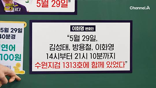 그랬더니 이화영 부지사가 5월 17일이 맞다고 얘기합니다. 이런 진술도 나옵니다. 조사를 마치고 수원구치소로 복귀했는데, 보통 구치소는 밤 10시에 취침 등이 꺼지는데 그날은 불 끄기 직전 구치소에 도착했다는 겁니다. 본인 거실로 이동하던 중 같이 생활하던 두 명의 수용자에게 이런 말을 했다는 거예요. “오늘 검사랑 김성태 회장이랑 한 잔 했다”고요.