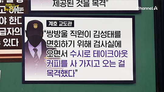 문제는 비용입니다. 밥값은 수사비로 내야 해요. 쌍방울 측 돈으로 먹으면 안 되는 거예요. 그 지점에 대해서는 아직 얘기가 없긴 합니다. 법무부 감찰 보고서에 따르면, 계호 교도관들의 목격담이 나옵니다. “검사가 김성태에게 식사 전 먹고 싶은 음식을 먼저 물어보았고, 김성태가 말한 음식이 도시락으로 제공된 것을 목격했다”고요. 또 “쌍방울 직원이 김성태를 면회하기 위해 검사실에 오면서 수시로 테이크아웃 커피를 사 오는 걸 목격했다” “마카롱과 쿠크다스, 햄버거를 사 온 걸 목격했다” 이런 교도관들의 목격담이 나오는 겁니다.
