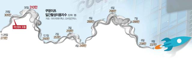 아이지에이웍스 모바일인덱스에 따르면 쿠팡이츠의 일간활성이용자수(DAU)는 이달 9일 기준 237만 명으로 추산됐다. 쿠팡의 개인정보 유출 소식이 전해진 후 첫 주말인 11월 30일 쿠팡이츠 DAU가 310만 명에 달했는데 일주일여 만에 23.5% 감소한 셈이다. 쿠팡이츠 이용자는 이달 6일부터 지속적으로 감소하는 추세다. 개인정보 유출 사태 전에는 쿠팡이츠가 수도권에 한해 배민을 제치고 1위를 차지했다.