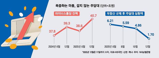은행연합회 통계에 따르면 올 10월 5대 시중은행의 신규 주담대 평균 금리는 4.12~4.47%였는데, 같은 기간 마이너스통장 평균 금리는 4.18~4.84%로 훨씬 높았다. 금리 안정성 측면에서도 주담대는 5년 고정형이 많지만, 마이너스통장은 1년 단위로 갱신해야 하기 때문에 높아진 금리도 그대로 반영될 수밖에 없다.