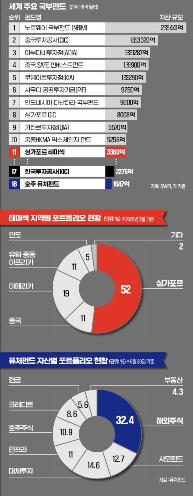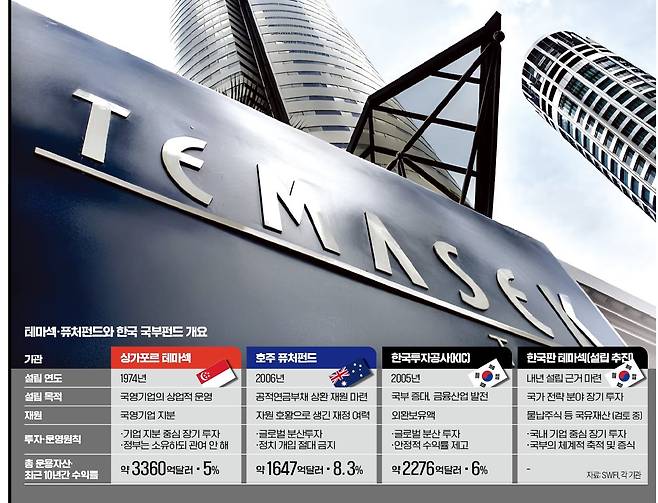 정부가 싱가포르 테마섹을 벤치마킹 대상으로 삼은 것도 이런 이유 때문인 것으로 풀이된다. 원유 같은 재원 없이 자국의 국부펀드를 세계 10위권으로 키운 나라가 싱가포르이기 때문이다. 1974년 공기업 35곳의 자산 2억달러로 설립한 테마섹의 운용자산은 현재 3360억달러로 불어났다. 비자, 마스터카드, 블랙록, 텐센트 같은 우량 글로벌 기업에 투자해 꾸준한 수익률을 유지한 덕분이다. 테마섹에 정통한 한 싱가포르 상무관 출신 전직 관료 A씨는 “인공지능(AI), 양자컴퓨터 등 기술 패권 경쟁 시대를 맞아 해외 첨단기술산업 정보를 얻기 위해서라도 국부펀드가 필요하다”며 “세계 유력 기업들이 대형 국부펀드에 투자해 달라며 정보를 제공하기 때문”이라고 말했다.