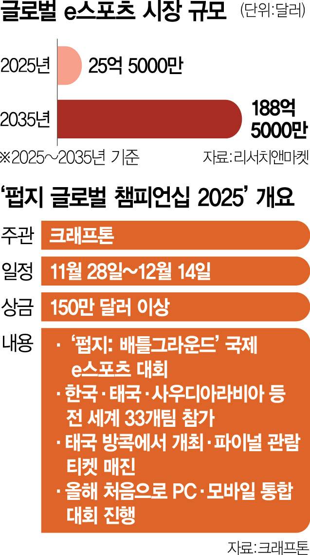 글로벌 시장조사 기관 리서치앤마켓에 따르면 전 세계 e스포츠 시장 규모는 올해 25억 5000만 달러(약 3조 7676억 원)에서 2035년 188억 5000만 달러(약 27조 8508억 원)까지 성장할 것으로 전망된다. 이 기간 예상 연 평균 성장률은 19.95%에 달한다.