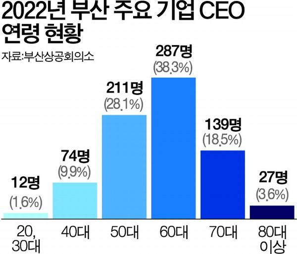 제조업 중심의 부산은 이 현상이 전국 평균보다도 높다. 2022년 기준 부산의 주요 제조업 CEO 평균 연령은 62.7세로, 전국 평균(57.9세)보다 4.8세나 높았다. 경영 활동이 왕성한 40, 50대 제조업 CEO 비중의 경우 부산은 38%로, 전국 평균(52.8%)에 미치지 못했다. 특히 부산 전체 기업의 60세 이상 CEO 비중은 28.3%인 반면 부산 주요 기업의 60세 이상 CEO 비중은 60.4%로 2배 이상 높았다.