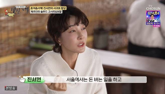 3년 차 제주 생활을 하는 중이란 진서연은 "서울 살면 촬영 때문에 너무 치열하다. 서울에선 에너지를 쏟고, 제주 오면 에너지를 받는다"라고 고백했다. 제주도 집 마당 뷰도 공개한 진서연은 "서울에선 돈 버는 일을 하는데, 제주도의 삶이 돈을 까먹는 삶이 아니다. 치장하지 않아도 되고, 항상 맨얼굴로 다닌다. 귤 받으러 가고, 운동도 매일 하고. 여기저기 많이 다니는 편"이라고 덧붙였다.