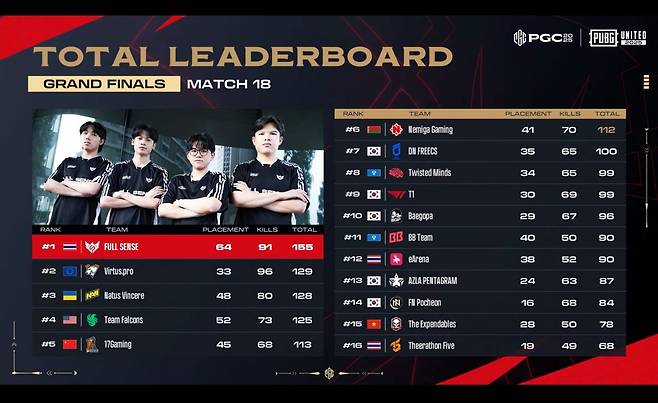 풀 센스는 14일 태국 방콕 파라곤시암 홀에서 열린 펍지 글로벌 챔피언십(PGC) 2025 그랜드 파이널(결승) 3일 차 경기(매치13~18)에서 37점을 추가하며 도합 155점에 도달, 우승컵을 들었다.