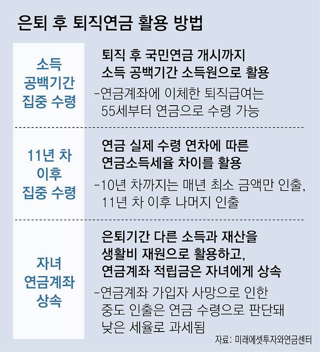 퇴직급여를 일시에 현금으로 수령할 때는 퇴직소득세를 납부해야 한다. 하지만 퇴직급여를 연금계좌에 이체하는 경우에는 당장 퇴직소득세를 납부하지 않는다. 세금은 퇴직급여를 연금계좌에서 인출할 때 부과한다. 연금계좌에 이체한 퇴직급여는 55세부터 연금으로 수령할 수 있다. 55세 이후 퇴직자는 퇴직하자마자 연금을 받을 수 있는 셈이다.