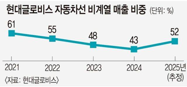 현대글로비스는 중장기적으로 비계열 매출 확대를 핵심 성장 전략으로 꼽고 있다. 2030년 매출 40조원 이상, 전체 매출 중 비계열 비중 40% 달성이 목표다. 글로벌 포워딩·해운·유통·배터리 재활용 등 주요 사업을 통해 외부 고객군을 넓힌다는 구상이다. 현대글로비스 관계자는 “해외 OEM 물량을 늘려 비계열 매출 비중을 지속적으로 확대할 계획”이라며 “안정적인 실적 기반을 구축하겠다”고 말했다.