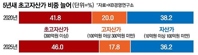 5년 전인 2020년의 자산가 38.2%, 고자산가 19.9%, 초고자산가 41.8%와 비교하면 자산가와 고자산가 비중이 각각 2%포인트가량 줄고, 초고자산가 비율은 4%포인트가량 늘었다.