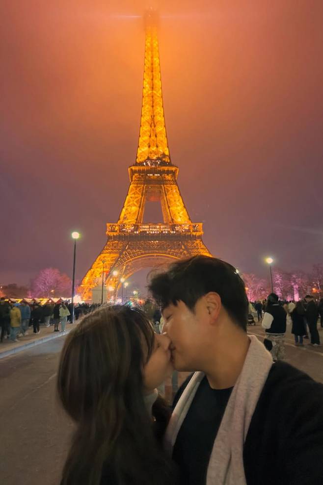 공개된 사진 속에서 하원미와 추신수는 프랑스 파리로 여행을 떠난 모습. 두 사람은 에펠탑을 배경으로 다정하게 입을 맞추고 있다.